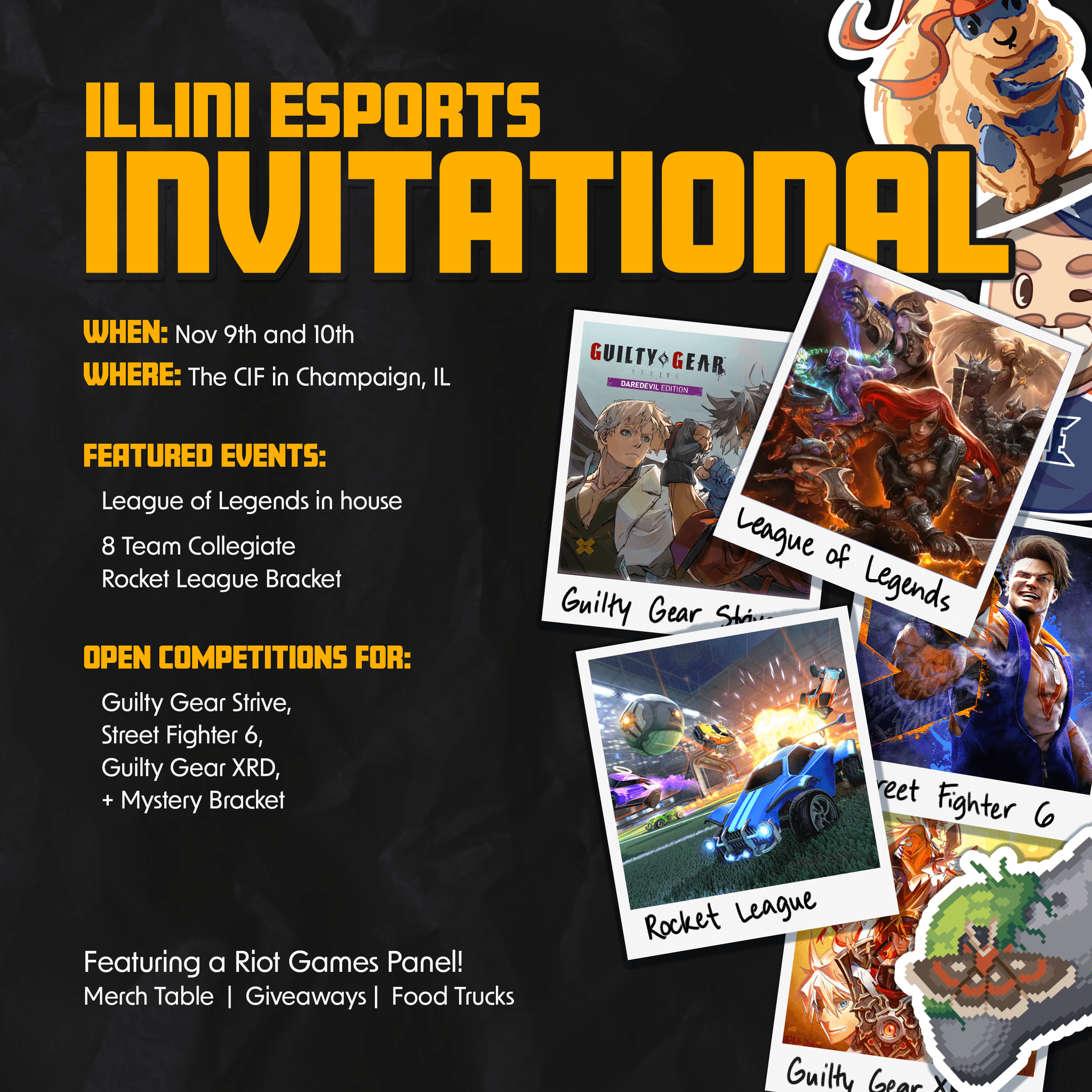 As a part of the Graphics Team, I've made various assets for Illini Esports, some of which became physical merchandise. In my time with Illini Esports, I used Photoshop and Illustrator extensively.